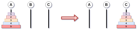 하노이 탑은 n개의 원반을 start(A)부터 via(B)를 통해, end(C)까지 옮기는 알고리즘입니다.