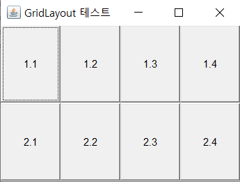 import java.awt.*; public class GridLayoutEx { public static void main(String[] args) { Frame f = new Frame("GridLayout 테스트"); f.setLayout(new GridLayout(2,3)); Button b1 = new Button("1.1"); Button b2 = new Button("1.2"); Button b3 = new Button("1.3"); Button b4 = new Button("1.4"); Button b5 = new Button("2.1"); Button b6 = new Button("2.2"); Button b7 = new Button("2.3"); Button b8 = new Button("2.4"); f.add(b1); f.add(b2); f.add(b3); f.add(b4); f.add(b5); f.add(b6); f.add(b7); f.add(b8); f.setLocation(300, 300); f.setSize(200, 200); f.setVisible(true); } }