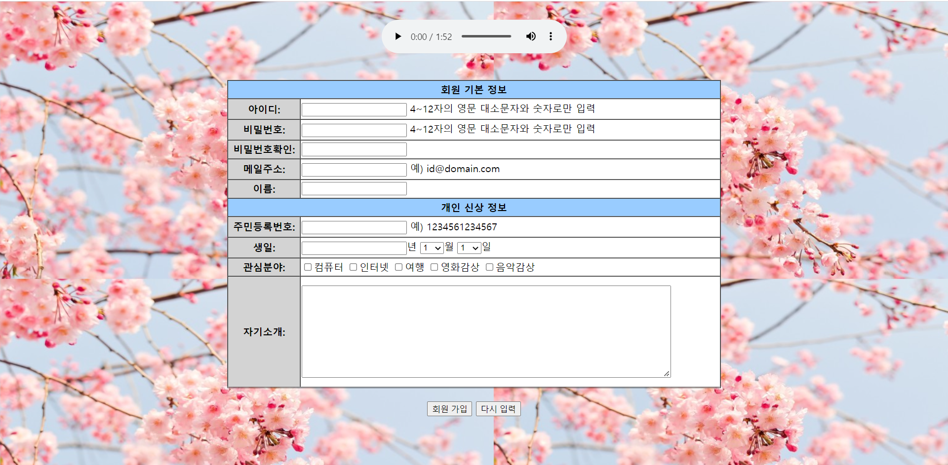 다시 입력 버튼은 입력했던 내용들이 모두 지워지며 초기화가 될 수 있도록 한다.