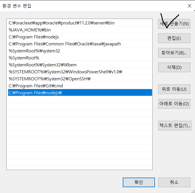 이후, 환경 변수 편집에서 [새로 만들기] 버튼을 눌러, Node.js가 깔린 해당 경로를 입력해 줍니다.