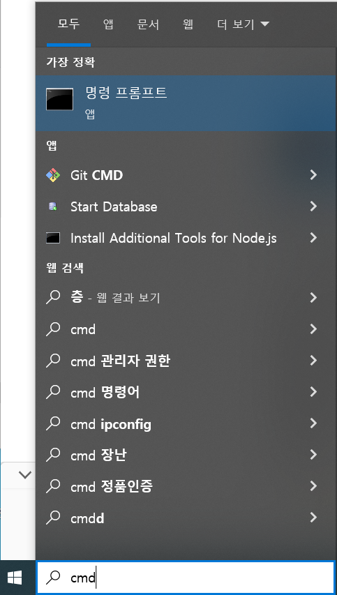 첫번째로는, 윈도우 사용 시, 검색창에 명령 프롬포트, cmd를 검색하는 방법입니다.